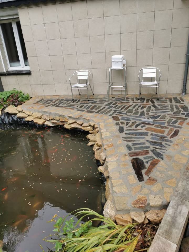 Coffrage avec coulage de béton pour ensuite coller des pierres par dessus autour d'un bassin tout en faisant attention a ne pas désagréger la vie du bassin.